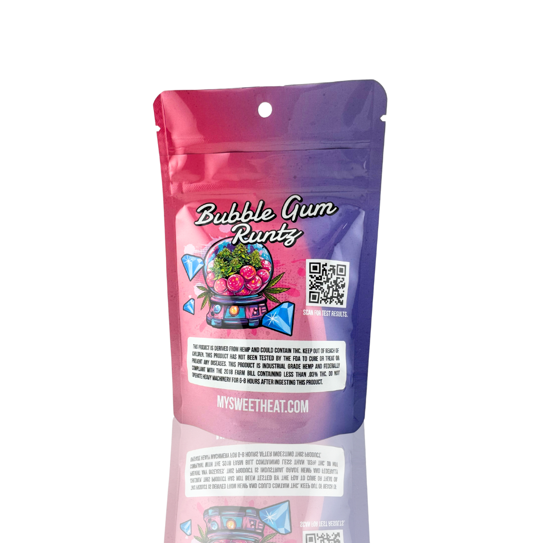 Bubble Gum Runtz is a hybrid strain made by crossing Runtz and Bubble Gum. The taste of Bubblegum Runtz is super sweet and sugary, with hints of fresh fruity pink bubblegum and sour, citrusy lemon candies galore dancing across your tongue. The aroma is very similar, almost like you're taking a stroll through a candy store and sampling the wares.